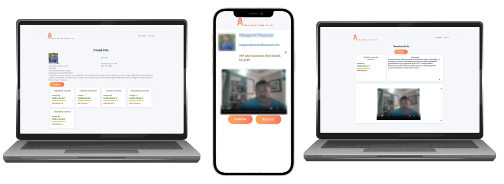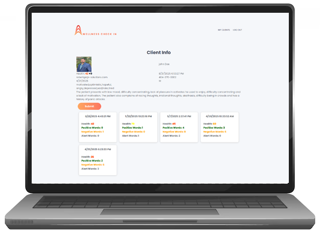 Wellness Check In, using AI technology, can help you give your clients the support they need between sessions. Short recorded videos from your clients are automatically analyzed and alerts are sent to the provider based on keyword & sentiments analysis. Healthcare providers can utilize these alerts and take action to assist their clients. Providers can use the data to track their clients over time.